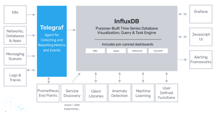 - Telegraf는 메트릭을 수집하고 보고하는 플러그인 기반 서버 에이전트입니다. Telegraf 플러그인은 실행되는 시스템에서 직접 다양한 메트릭을 가져오고 타사 API에서 메트릭을 가져 오거나 StatsD 및 Kafka 소비자 서비스를 통해 메트릭을 수신합니다.
