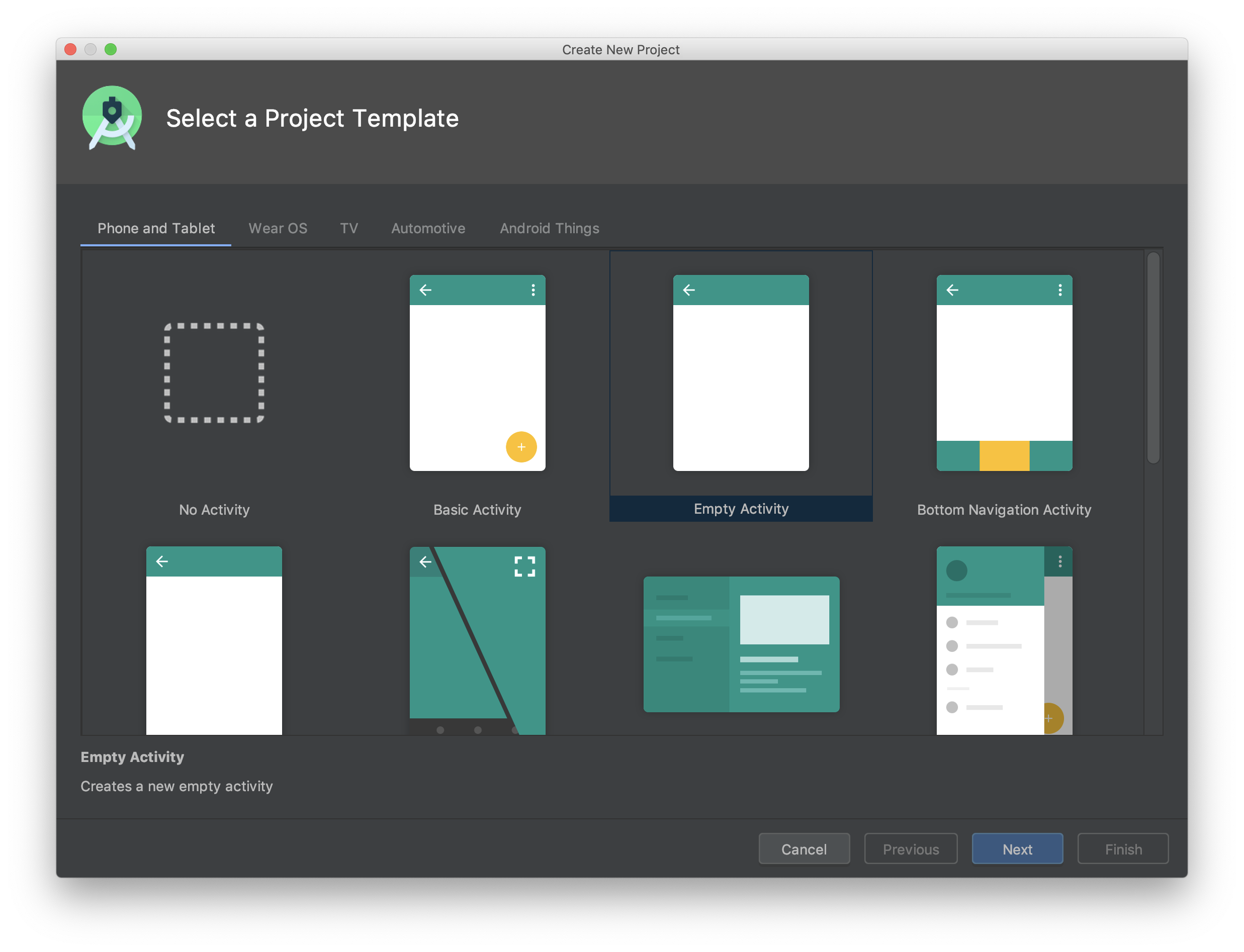 기본적인 맵 사용법을 테스트할 프로젝트를 엽니다. 여기서는 Empty Activity를 사용합니다.