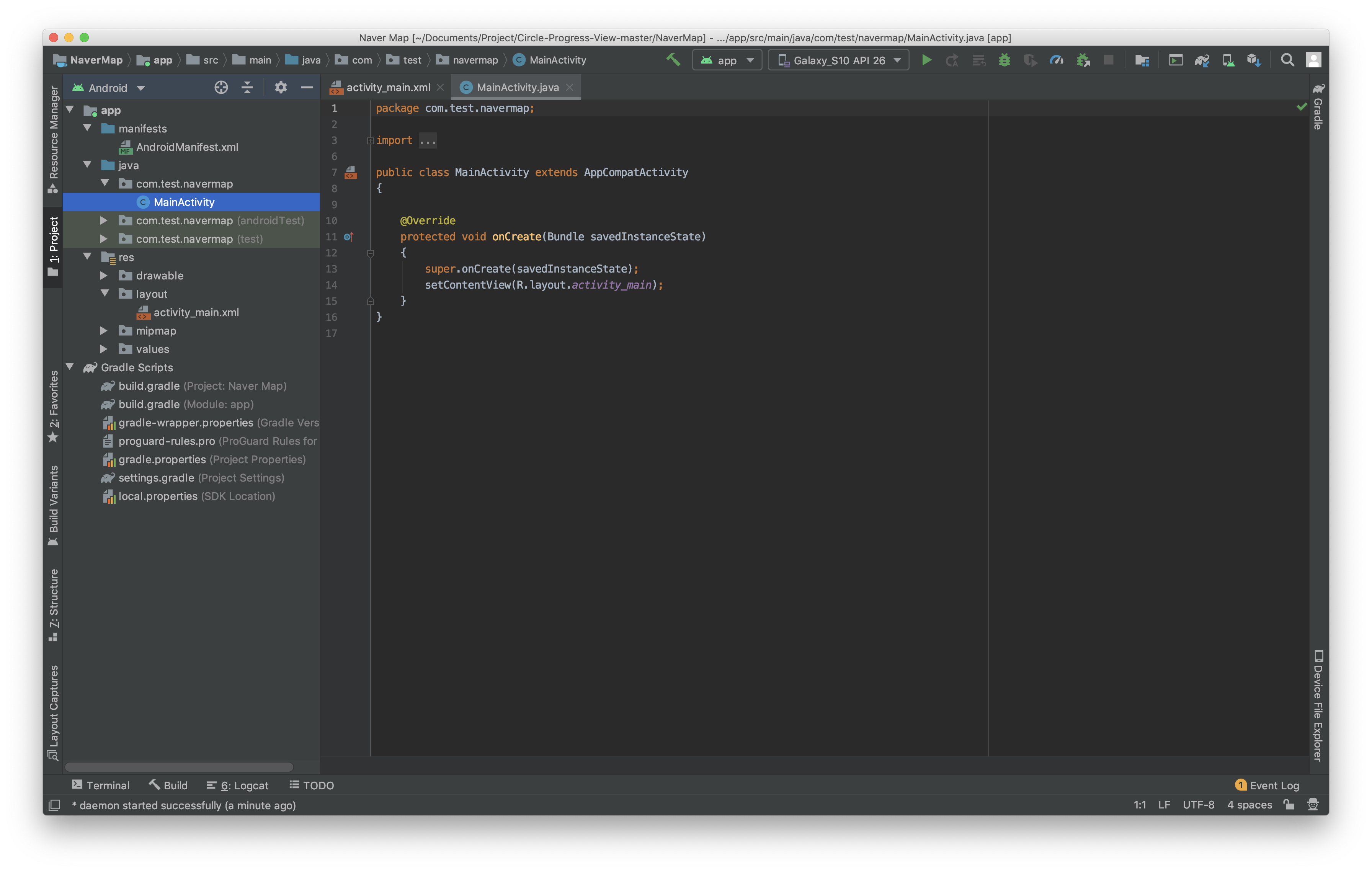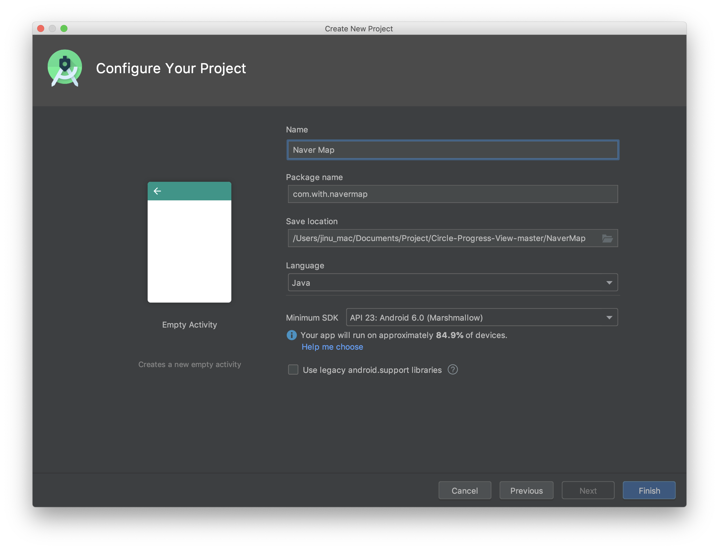 이름은 Naver Map으로 했고 패키지네임은 com.test.navermap으로 했습니다.