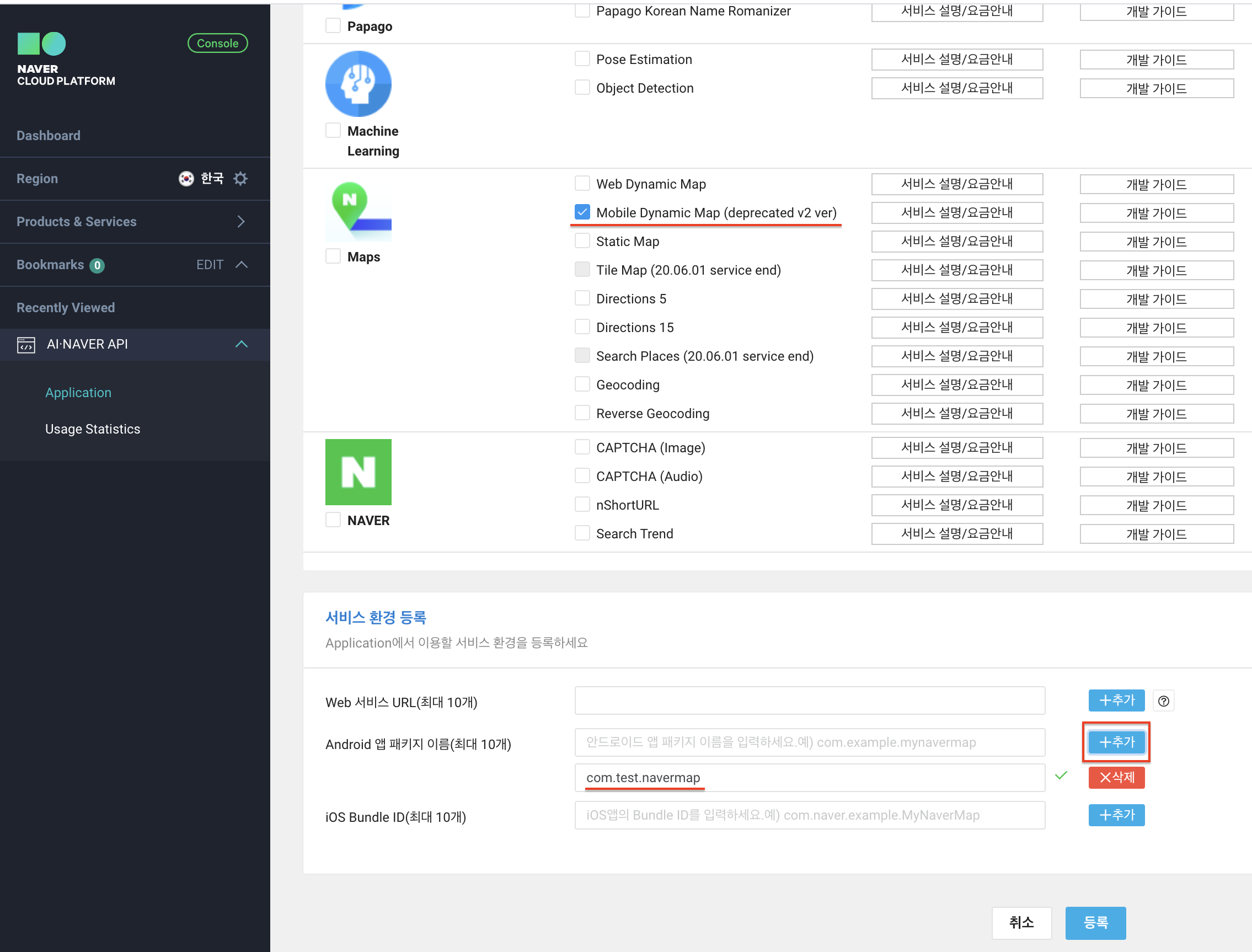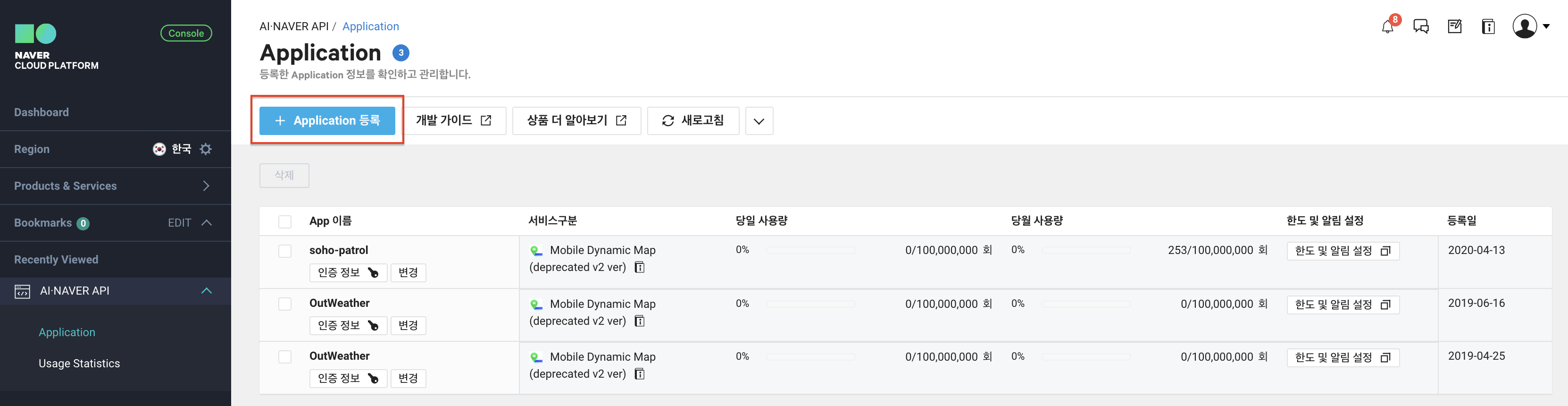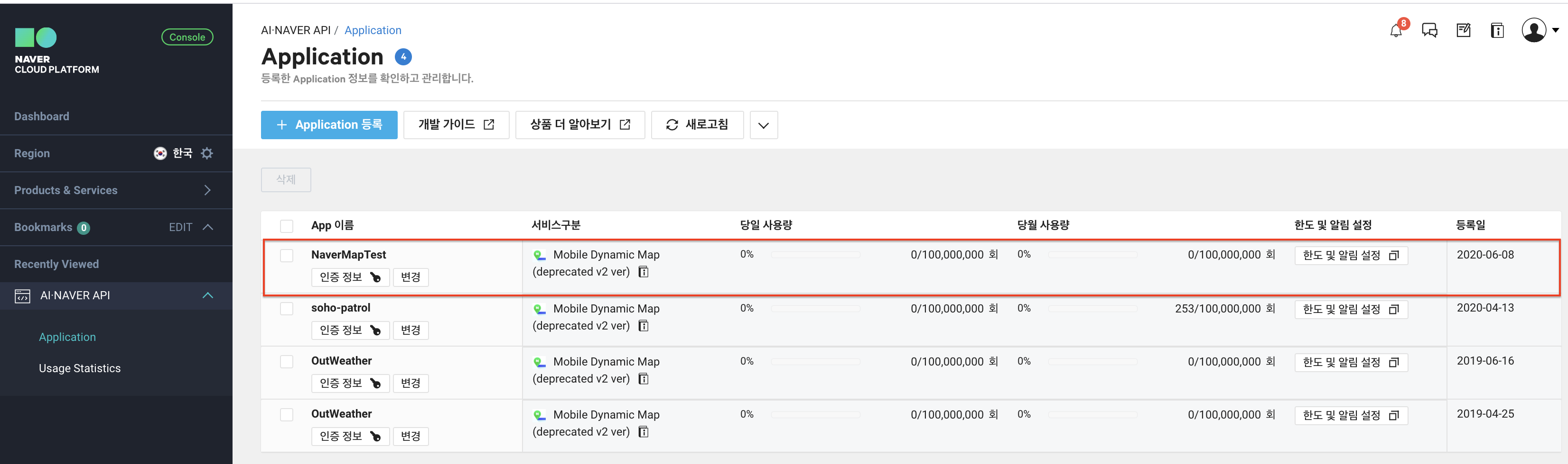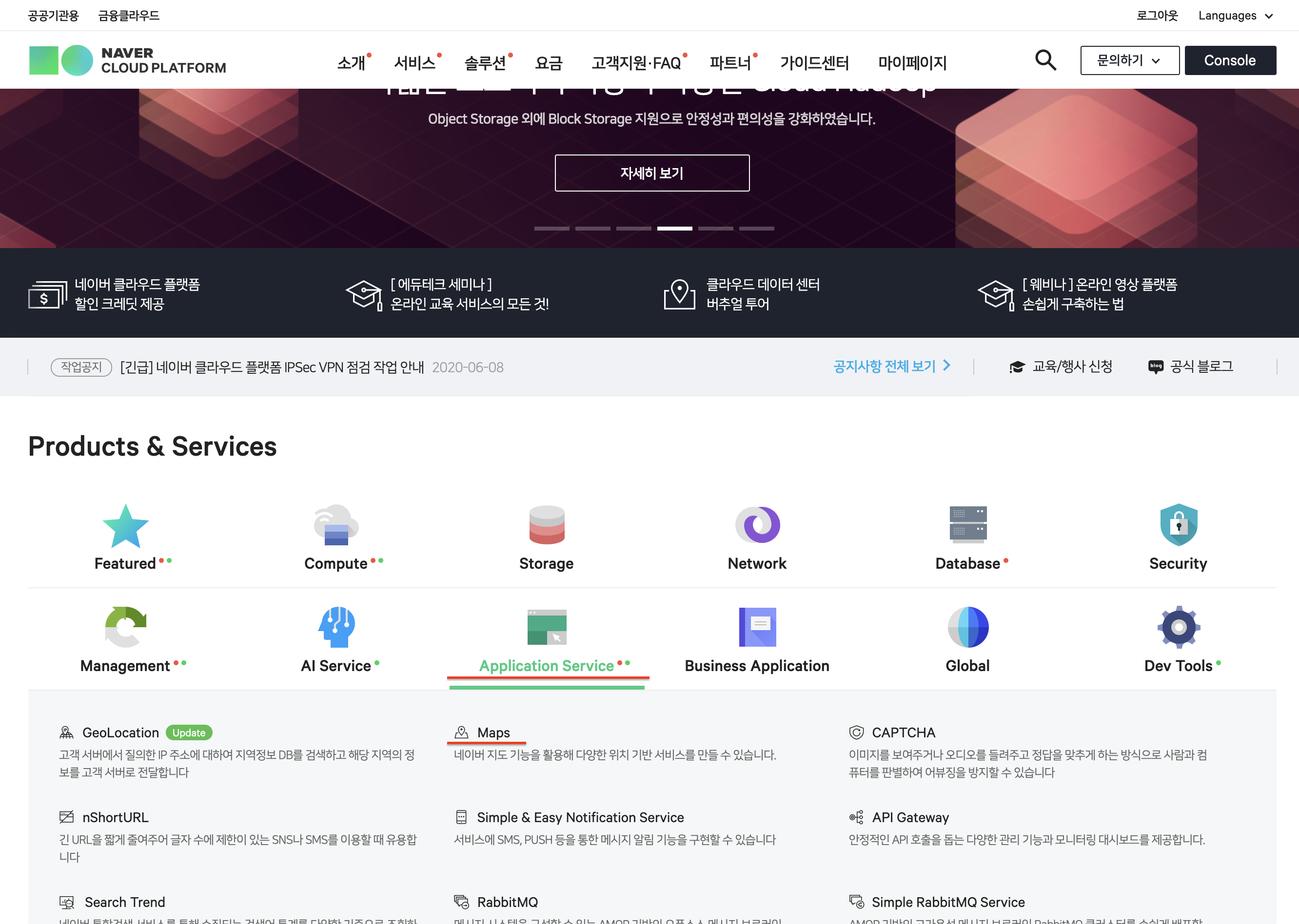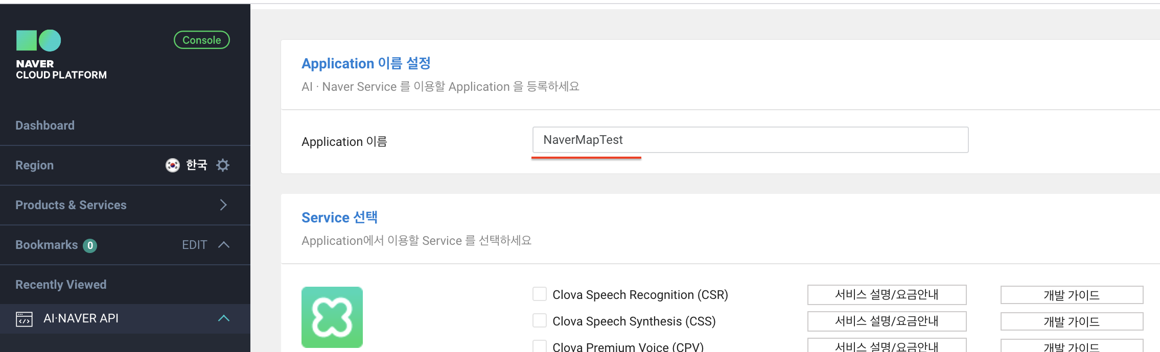 네이버 지도는 메뉴 중 Application Service 중에 Maps로 되어 있습니다. Maps를 선택합니다.