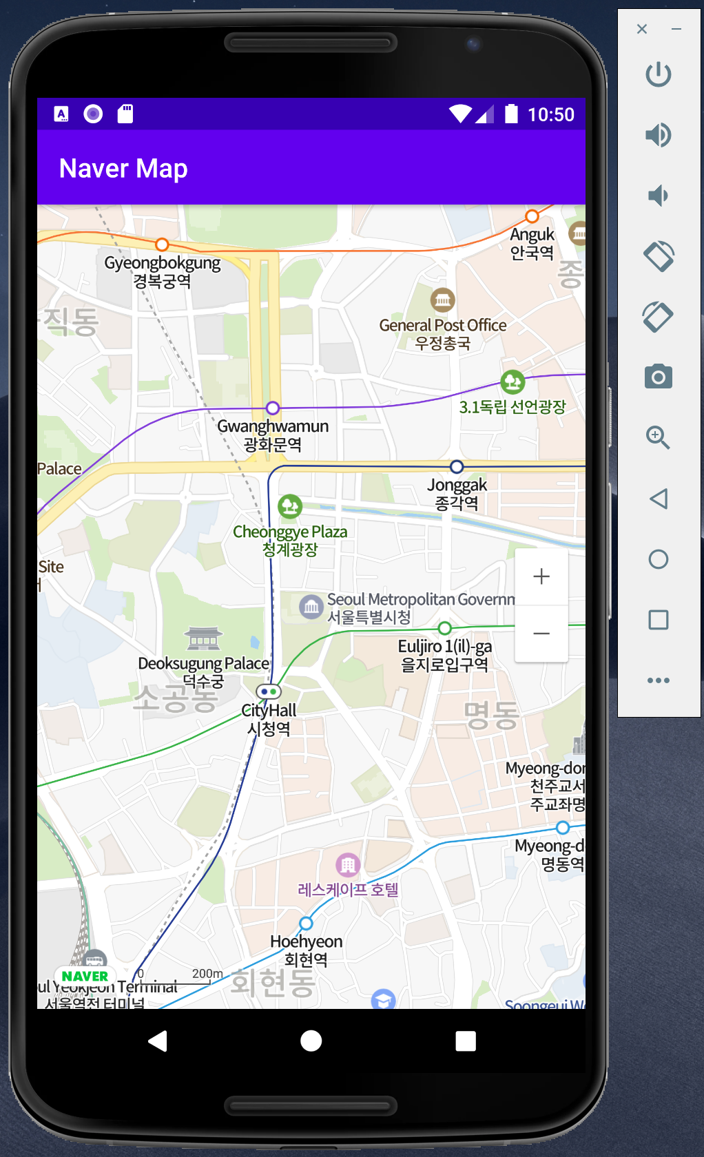 일단 이렇게만 코딩하시고 실행을 시키셔도 네이버 지도가 뜨는걸 확인 할 수 있습니다.